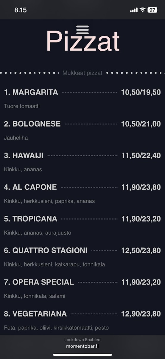 The menu at Momento Bar offers a delightful array of dishes that cater to various tastes, providing a satisfying dining experience for every visitor. Among the standout options, the House Special Pizza takes the spotlight with its unique combination of fresh ingredients, making it a must-try for pizza lovers. The Americana pizza also makes a bold statement, offering a classic yet fulfilling flavor that is always a crowd favorite.